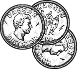 The denarius (silver), which bears an image of a younger Caesar on the obverse and Caesar, Joshua Graham and Bill Calhoun on the reverse. The inscriptions are in Latin, "Caesar Dictator" meaning "Dictator Caesar" or "Absolute Ruler Caesar" on the front and "Magnum Chasma" meaning "Great Abyss," "Great Chasm" or "Great Fissure" on the back, referring to the Grand Canyon. The symbolism is simple; the denarius commemorates young Caesar's journey to the Grand Canyon and his first victories as a dictator of the Grand Canyon tribes.