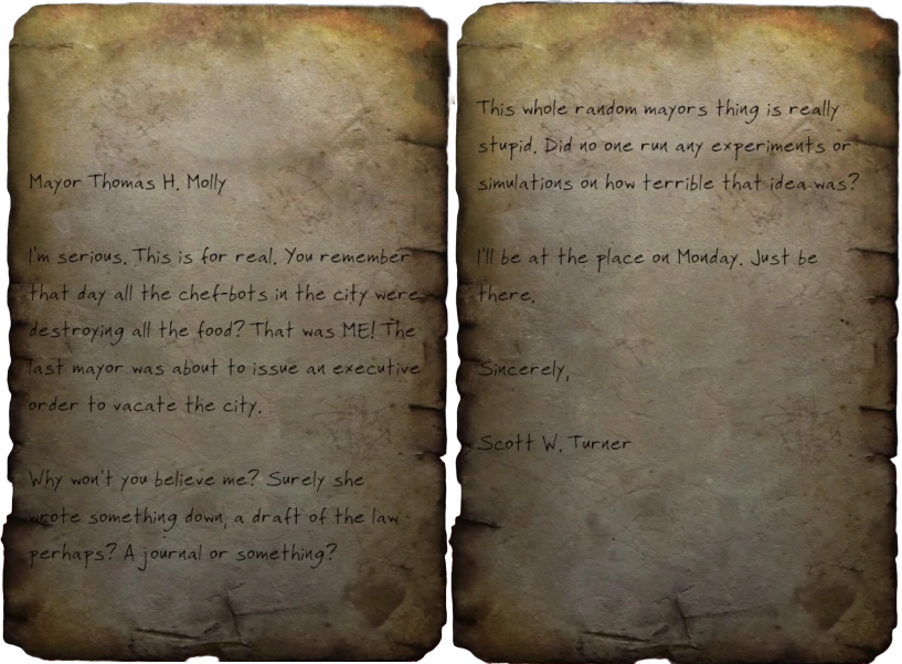 I'm serious. This is for real. You remember that day all the chef-bots in the city were destroying all the food? That was ME! The last mayor was about to issue an executive order to vacate the city.