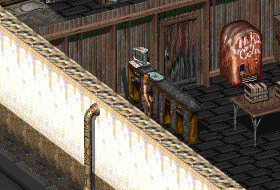 Liz runs the general store in Broken Hills, selling a bunch of items with a frown and a hefty price tag. By helping the human conspirators blow up the mine's air purifier, she will let the Chosen One into the back room of her shop, where a ladder leads to a hidden weapons cache. Another way to gain access to her basement without sneaking or combat is to buy drinks from Phil and pay him a total of $20 in tips, after which he will mention the weapons cache. Liz can be told about it, saying it came from "a reliable source," and by passing a Speech check she will permit use of the weapons against the mutants.