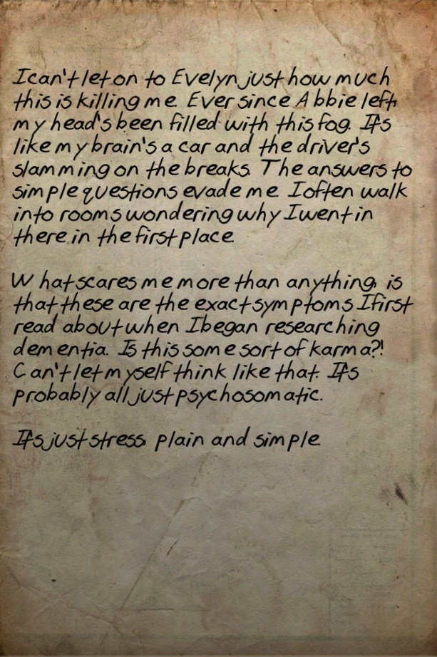 I can't let on to Evelyn just how much this is killing me. Ever since Abbie left, my head's been filled with this fog. It's like my brain's a car and the driver's slamming on the breaks. The answers to simple questions evade me. I often walk into rooms wondering why I went in there in the first place.