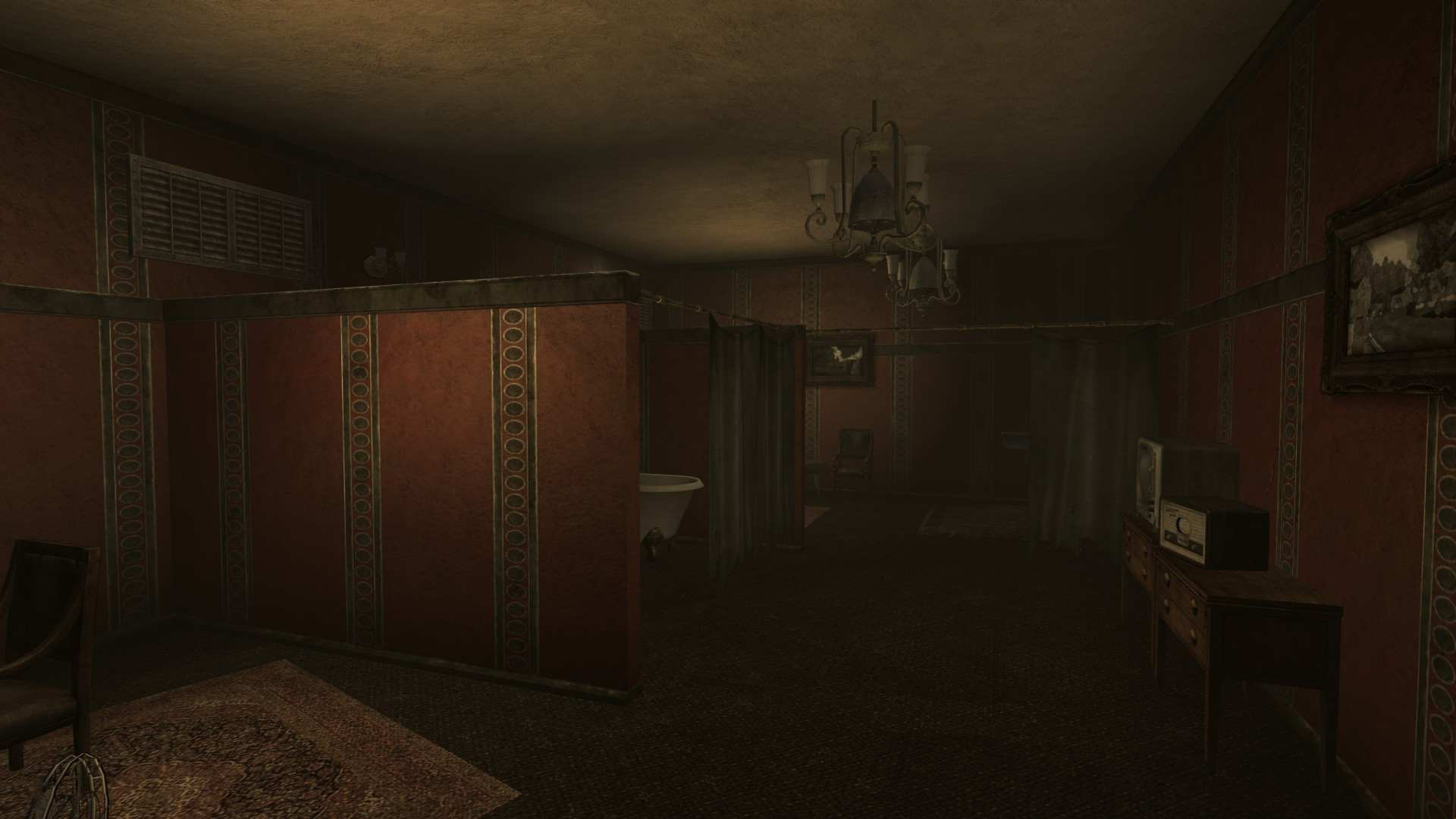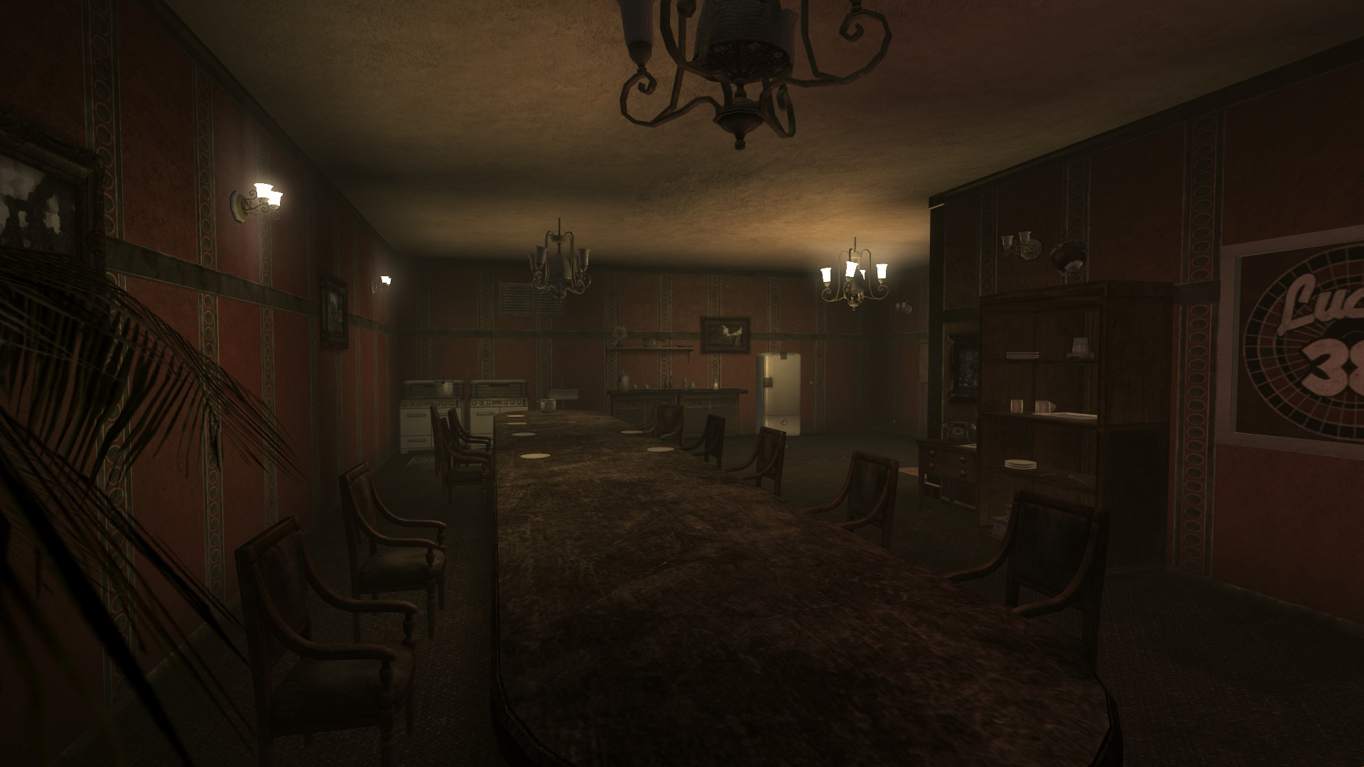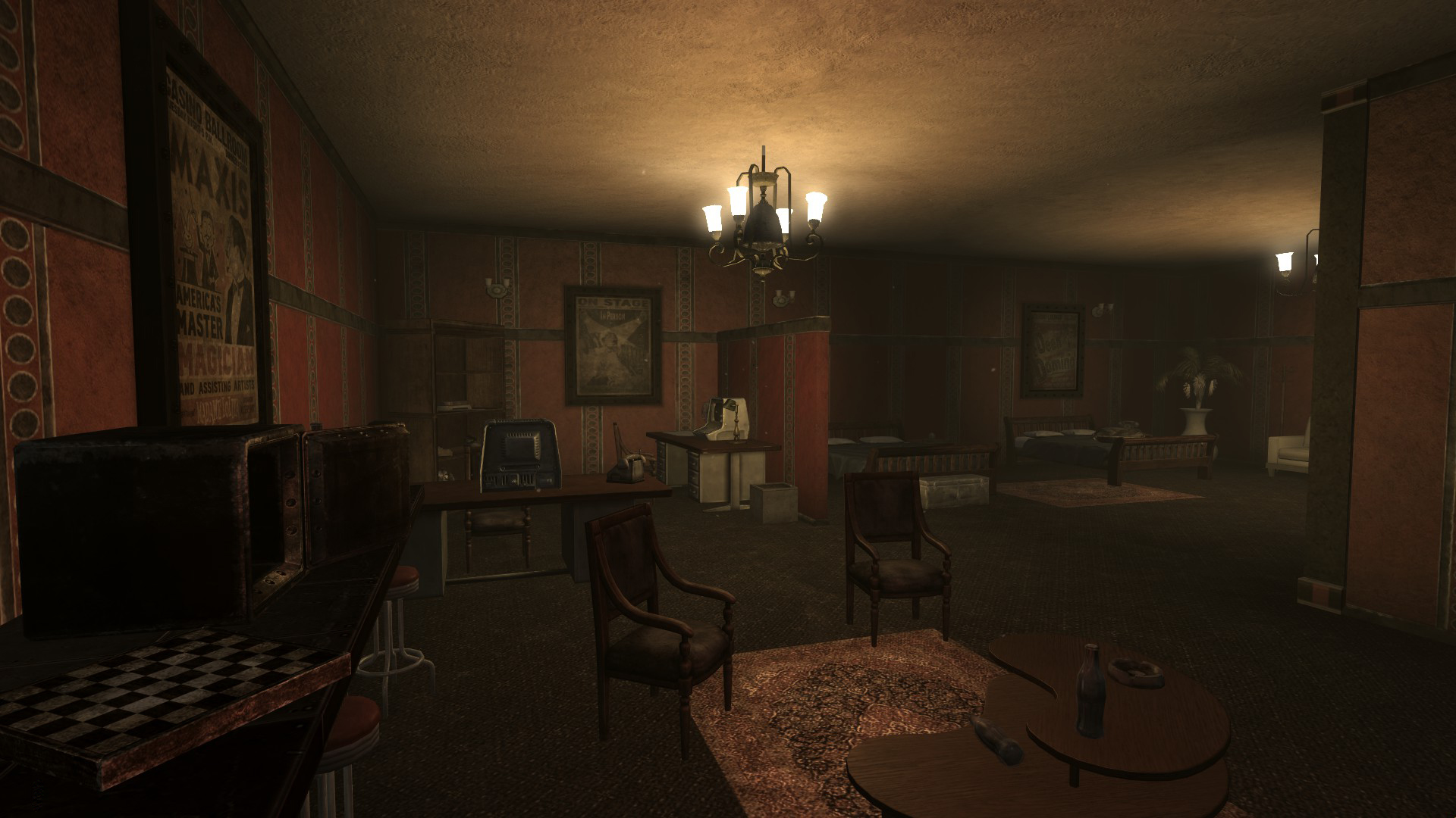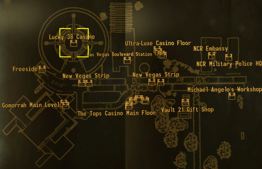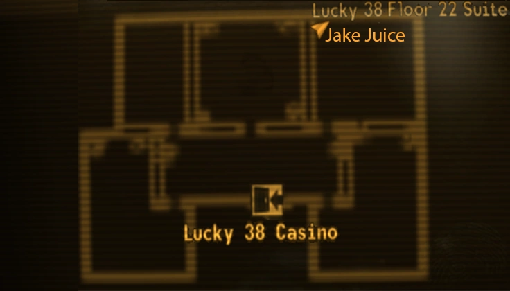 Situated on the 22nd floor[2] of the Lucky 38 tower, the presidential suite features a master bedroom, a guest room, a kitchen, a bathroom, and a recreation room. House improvements such as additional furniture can be bought from a terminal in the suite foyer as well as to sell items that remain in the inventory.