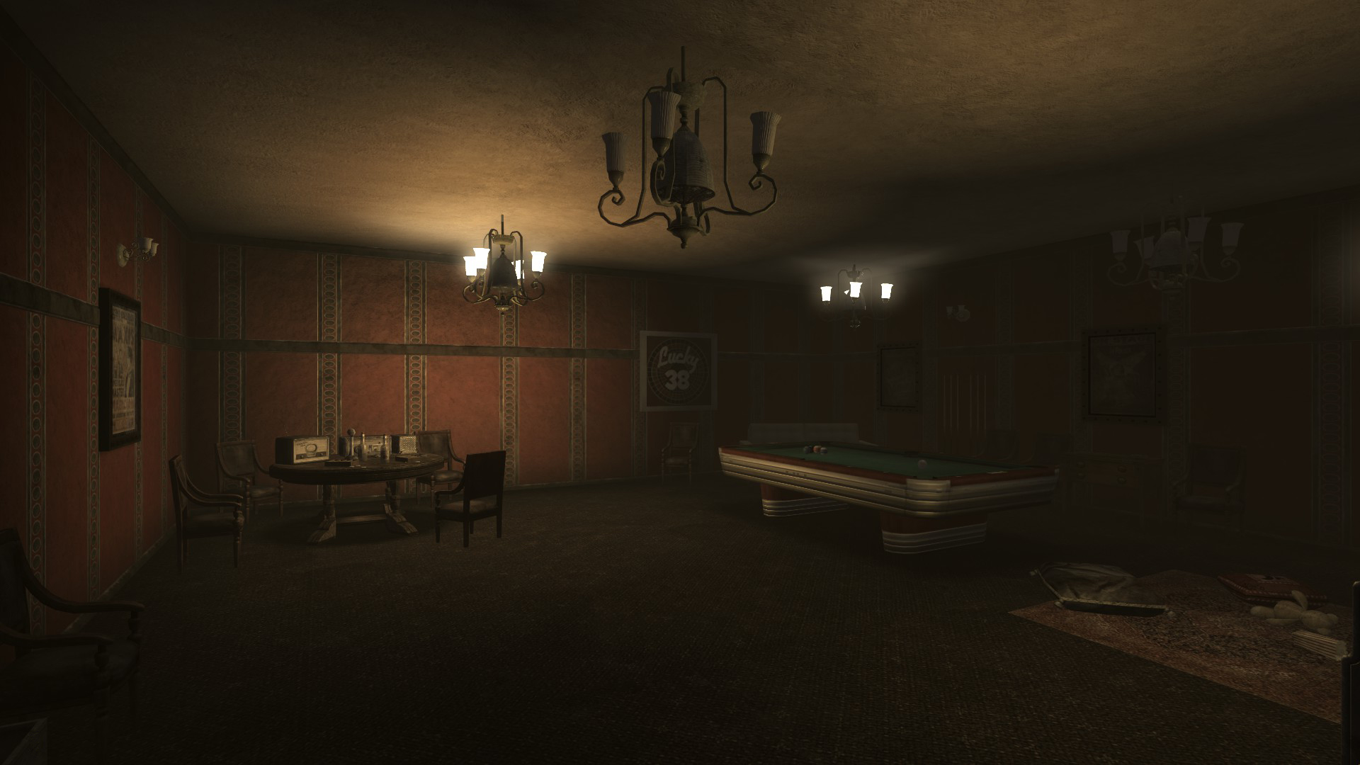 - On the pool table in the recreation room, there are 5 billiard balls in the shape of an arrow. The numbers on the balls add up to 38 and the arrow points directly to one of several Lucky 38 posters.