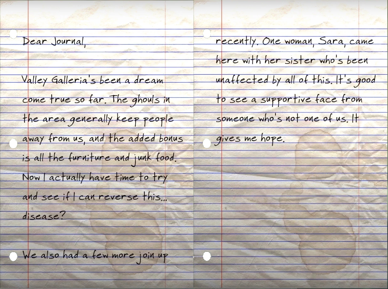 Valley Galleria's been a dream come true so far. The ghouls in the area generally keep people away from us, and the added bonus is all the furniture and junk food. Now I actually have time to try and see if I can reverse this... disease?