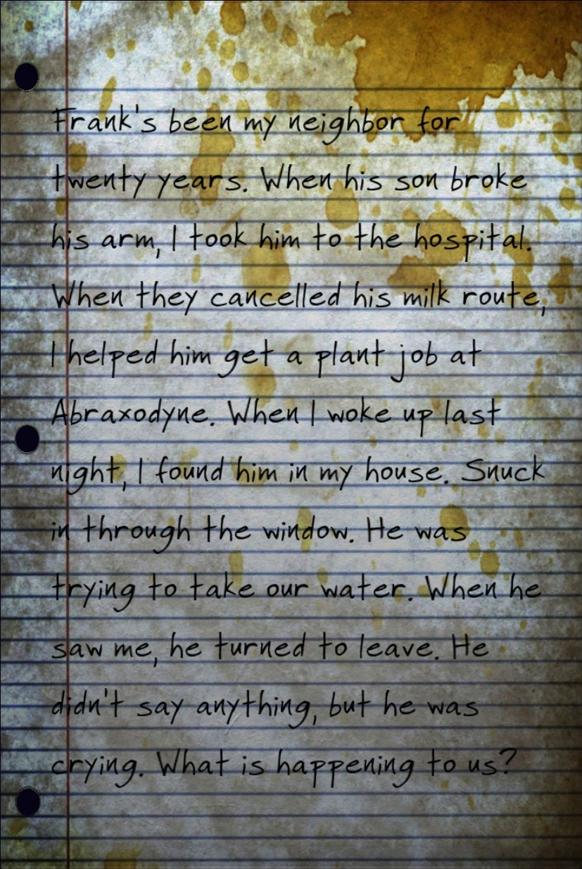 Frank's been my neighbor for twenty years. When his son broke his arm, I took him to the hospital. When they cancelled his milk route, I helped him get a plant job at Abraxodyne. When I woke up last night, I found him in my house. Snuck in through the window. He was trying to take our water. When he saw me, he turned to leave. He didn't say anything, but he was crying. What is happening to us?