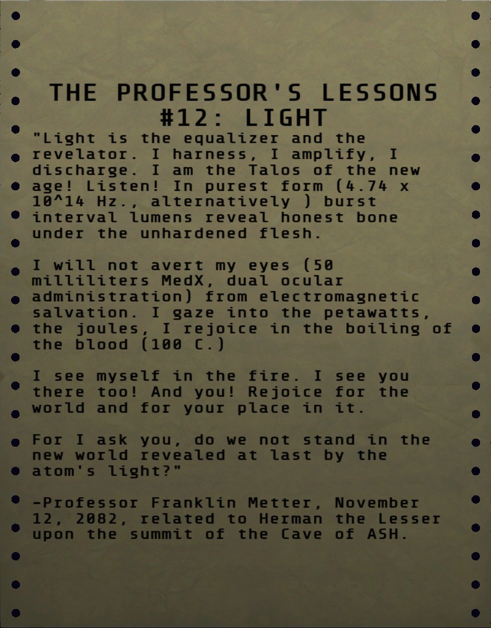 Meditations on light is a paper note in Fallout 76, introduced in the Burning Springs update.