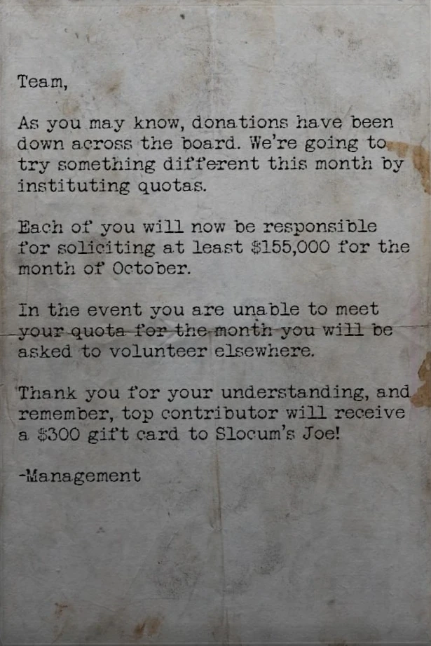 As you may know, donations have been down across the board. We're going to try something different this month by instituting quotas.