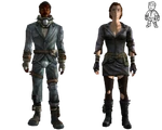 - Male - A blue leather jacket with re-bar shoulder arches and bracelets, along with a few war medals, a rebreather/gas mask of some kind hanging around the neck, and some brown pants make up this suit of clothing.