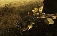 Situated west by southwest of the California Sunset Drive-in and due east of Mesquite Mountains crater, from a distance, an antenna can be seen protruding from sheet metal at the edge of a small cliff. Beneath the makeshift shelter is a parked motorcycle and a road cone that is booby-trapped with a frag mine. Behind the motorcycle is a mattress and to the right is a half-buried box.