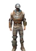 An armor set composed of rusted metal plating discolored from wear and time, welded together as makeshift ballistic protection. Comes in light, sturdy, and heavy variants, each with increasing amounts of welded-on parts. Modifications include fresh paint, enamelware, muted coloring for low-light traversal, refinement with alloy material, and a complete surface polish.