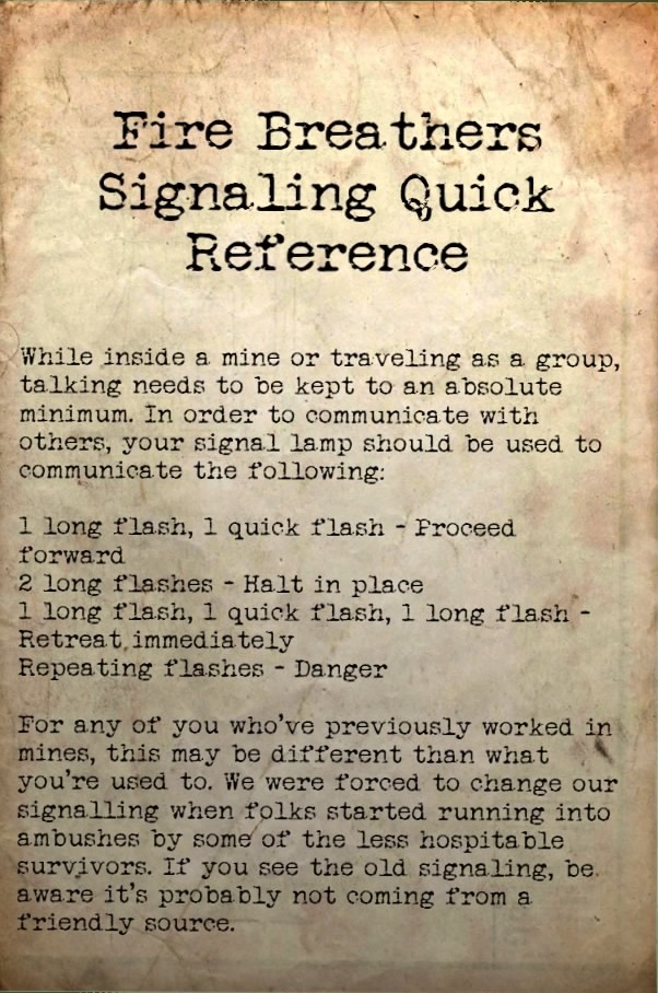 For any of you who've previously worked in mines, this may be different than what you're used to. We were forced to change our signalling when folks started running into ambushes by some of the less hospitable survivors. If you see the old signaling, be aware it's probably not coming from a friendly source.