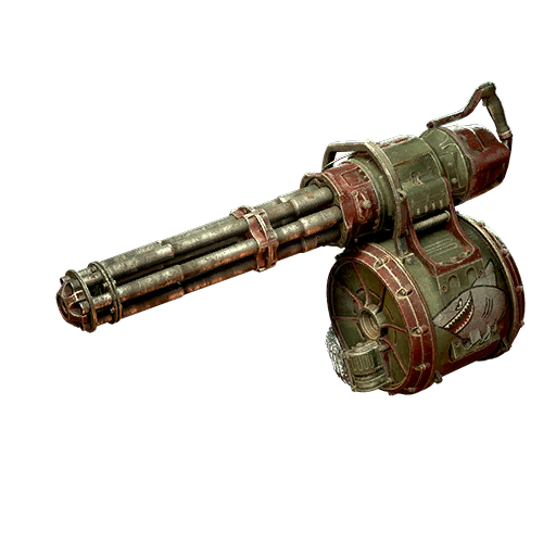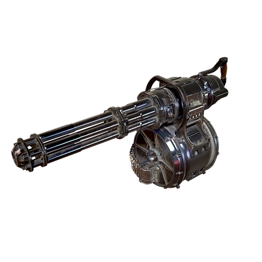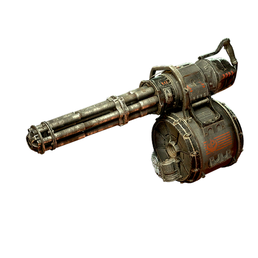 It requires a moment to spin up before it actually starts firing, but makes up for the delay with a high rate of fire and large ammunition capacity. As can be expected from a motorized rotary gun, it burns through ammo reserves at a high rate, even more so when equipped with accelerated barrels. Investing points in the Scrounger perk card and installing the tri-barrel modification helps to alleviate this issue to some extent. The latter significantly increases the minigun's per-shot damage, range, and accuracy at the cost of a sharp drop in firing rate, all of which make the weapon a lot more cost-efficient and effective at mid to long range.