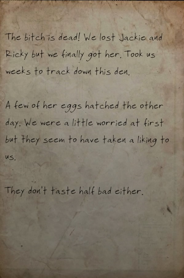 Mirelurk den is a paper note in Fallout 76, introduced in the Expeditions: Atlantic City update part one, Boardwalk Paradise.