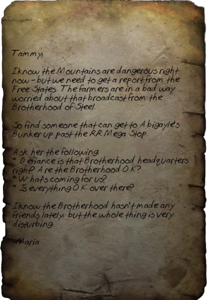 I know the Mountains are dangerous right now - but we need to get a report from the Free States. The farmers are in a bad way worried about that broadcast from the Brotherhood of Steel.
