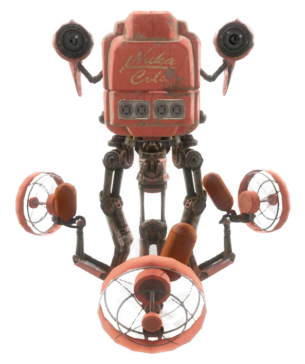 Mister Frothy is a custom, Nuka-Cola Corporation variant of Mister Handy created for use in Nuka-World's Galactic Zone. Its torso is shaped like a miniature Nuka-Cola machine, painted red with the Nuka-Cola logotype printed on the front. At the end of each of its arms is a fan, used to spray guests with Nuka-Cola as a tourist attraction before the war.