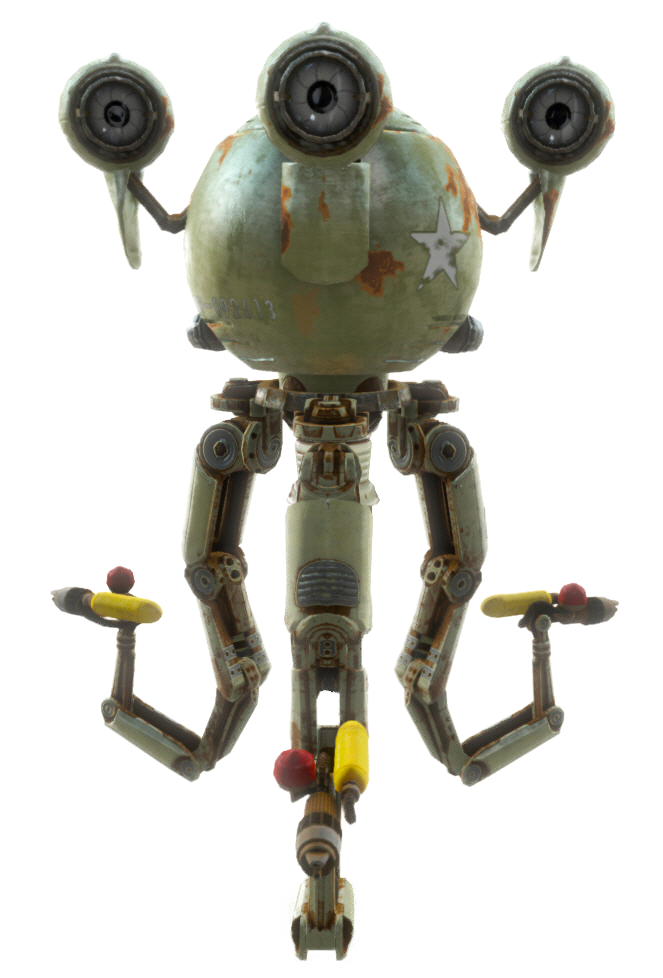 However, as rugged and reliable as the original Mr. Handy was, it was still a design rooted in the technology of the 2030s, with a compact computer brain that was incapable of learning or executing complex tasks without extensive programming. By the 2070s, it was an automaton surrounded by more advanced designs utilizing cutting edge neural networks. In order to maintain their market share, General Atomics entered into a joint venture with RobCo Industries, combining its talent with General Atomics' experience in robotics.[2][3][4] The resulting model was a sleek, elegant design capable of self-programming and initiative, more than making up for halving the number of arms to just three. Despite its sophistication, it was also cost-effective, making it the perfect domestic servant robot.[5][6] The success of this model resulted in the development of several additional models, including dedicated medical and military versions.[7] Sometime before the Great War, General Atomics International and RobCo wanted to upgrade their Mister Handy line by adding an additional hand alongside additional features.[8][9]