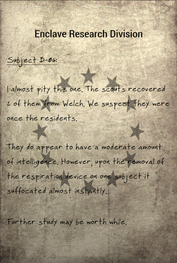 The note is located on a table in a lab in the Enclave research facility, in the room just past cell block B. Although the note is about mole miners, it is in a room containing tubes that hold mirelurks.