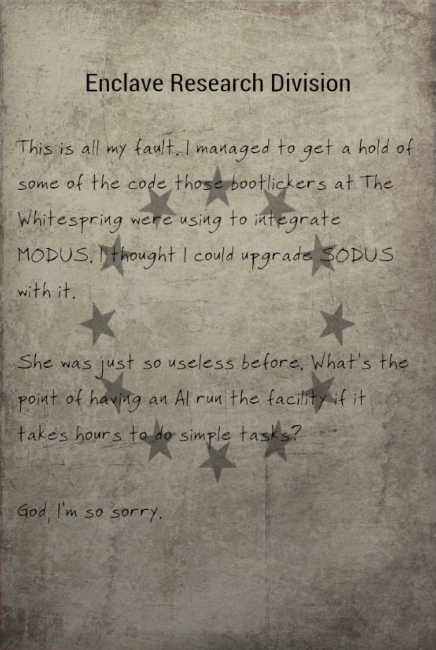 The note is located in the Enclave research facility, on a table in the southeastern-most room in the first section of living quarters, to the left of a set of double doors. The room itself is behind a Picklock level 1 lock.