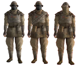Joshua Sawyer: "'Who thought up of the World War I-era helmet uniform in the NCR?' That was me working with Brian Menze, I believe." - ↑ Resources:Fallout: New Vegas 10th Anniversary Charity Stream: "Any reason Brian and I chose the World War One outfits? Um, there is like a neat kind of distinctive deserty vibe, especially like the Australian, like the Anzac type of uniforms that we saw. They just had a neat kind of vibe to them. They seemed, they had their first, you know, first half of the 20th century vibes. They kind of fit well in the desert. Um, yeah, we just thought they had the right vibe to them, is kind of the idea. Um..."