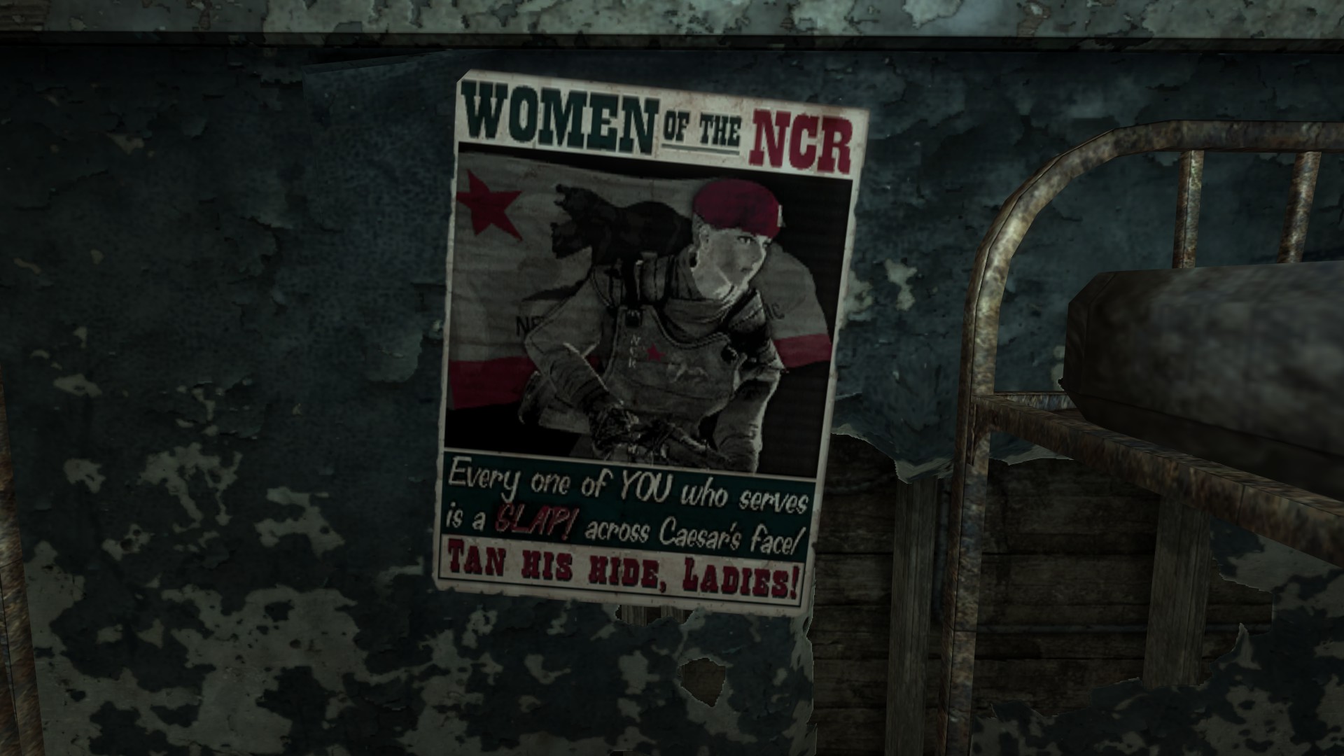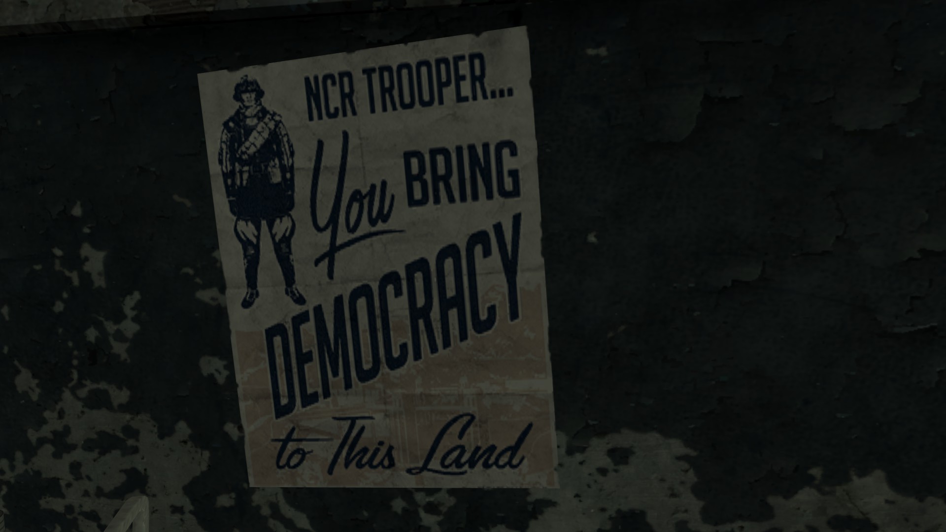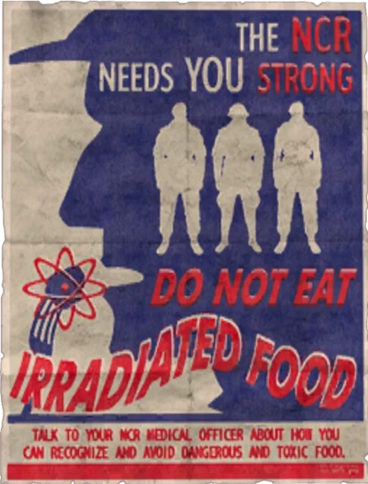 NCR propaganda posters are scenery items appearing in Fallout 2, in Fallout: New Vegas, and in the Fallout TV series. They are meant to spread a positive image of the New California Republic and encourage people to support the NCR or join its armed forces.