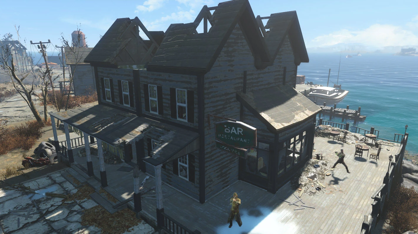 Outside the bar is a patio with further seating facing a pier to the south. The entire area is often contested by various factions, such as the Gunners and the Brotherhood of Steel.