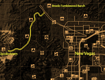 Beginning near the old ski lodge, the roadway continues down Mount Charleston into the Vegas valley to its terminus at Highway 95. Following it westbound is the only means to reach the isolated super mutant enclave of Jacobstown.
