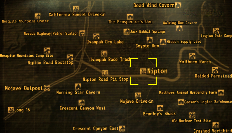 - The two state line roadsigns directly outside of Nipton exist in the real world, but are located at the south end of the real world Primm along Interstate 15. The game versions were based on the real-life signs before they were replaced in 2021.