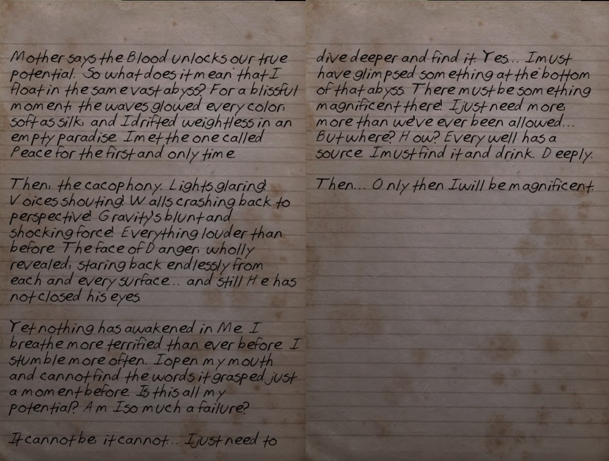 Mother says the Blood unlocks our true potential. So what does it mean that I float in the same vast abyss? For a blissful moment, the waves glowed every color, soft as silk, and I drifted weightless in an empty paradise. I met the one called Peace for the first and only time.
