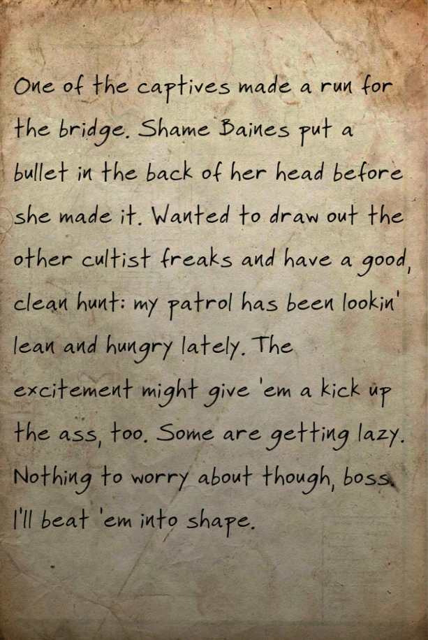 One of the captives made a run for the bridge. Shame Baines put a bullet in the back of her head before she made it. Wanted to draw out the other cultist freaks and have a good, clean hunt: my patrol has been lookin' lean and hungry lately. The excitement might give 'em a kick up the ass, too. Some are getting lazy.
