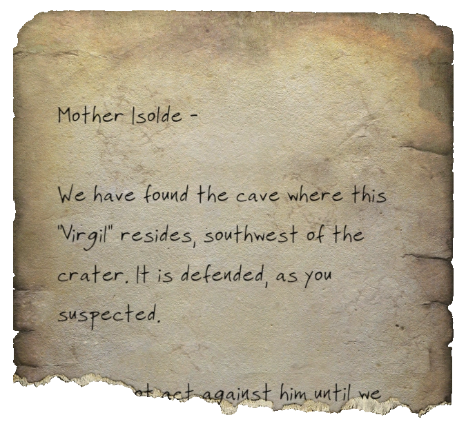 We have found the cave where this "Virgil" resides, southwest of the crater. It is defended, as you suspected.