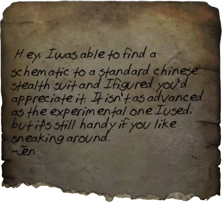 Hey, I was able to find a schematic to a standard chinese stealth suit and I figured you'd appreciate it. It isn't as advanced as the experimental one I used, but it's still handy if you like sneaking around.