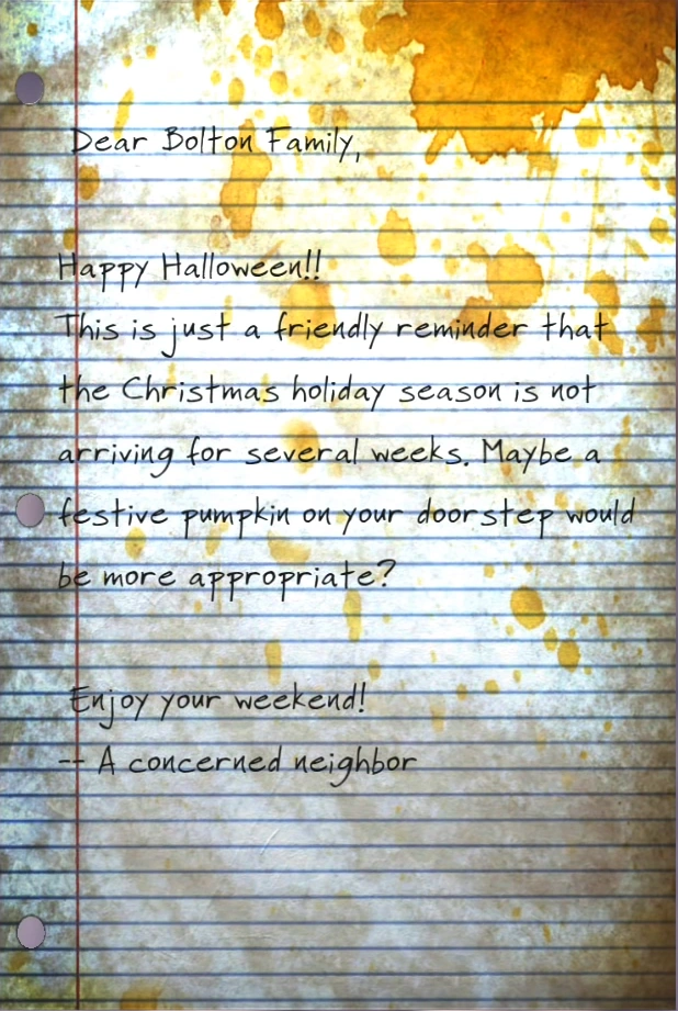 This is just a friendly reminder that the Christmas holiday season is not arriving for several weeks. Maybe a festive pumpkin on your doorstep would be more appropriate?