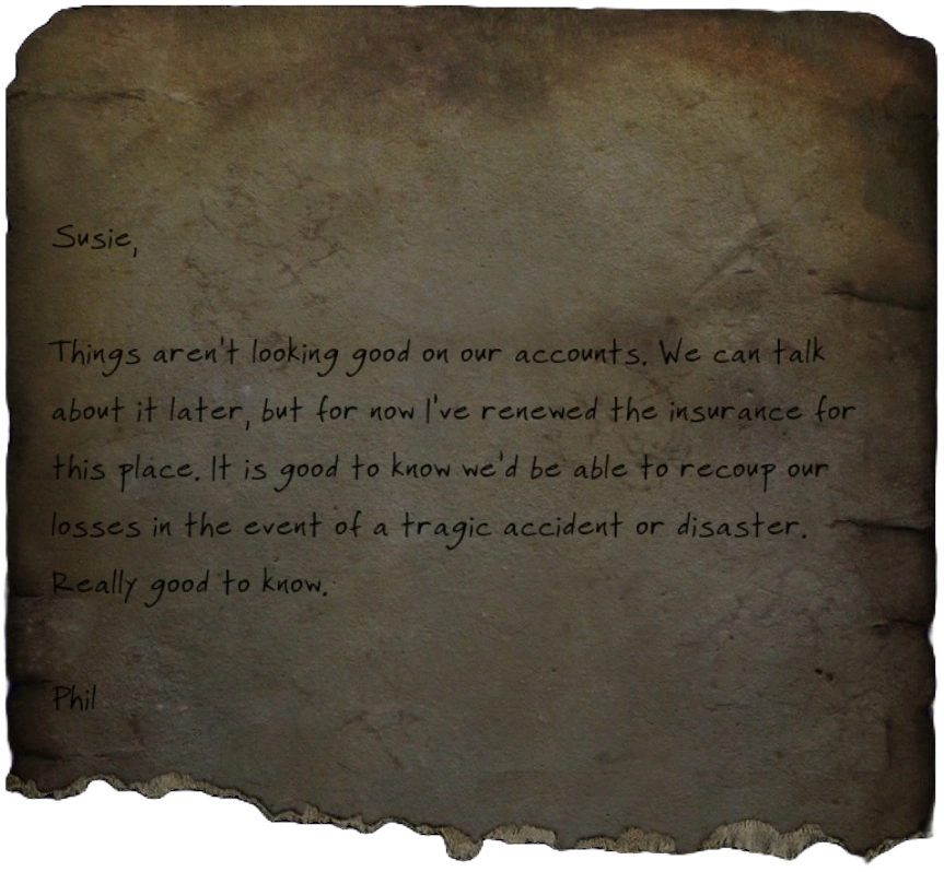Things aren't looking good on our accounts. We can talk about it later, but for now I've renewed the insurance for this place. It is good to know we'd be able to recoup our losses in the event of a tragic accident or disaster. Really good to know.