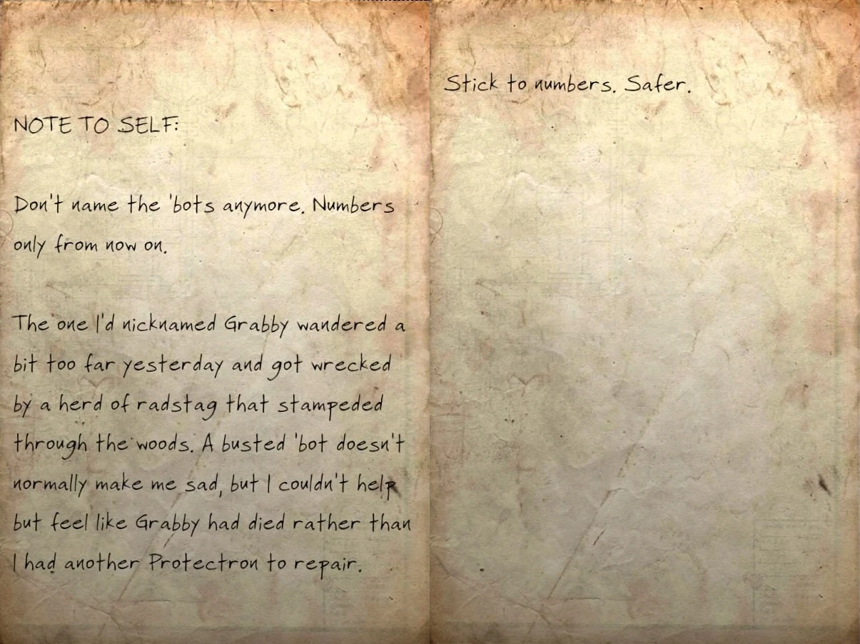 The one I'd nicknamed Grabby wandered a bit too far yesterday and got wrecked by a herd of radstag that stampeded through the woods. A busted 'bot doesn't normally make me sad, but I couldn't help but feel like Grabby had died rather than I had another Protectron to repair.