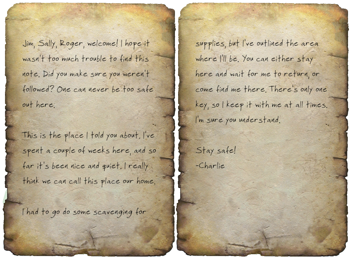 Jim, Sally, Roger, welcome! I hope it wasn't too much trouble to find this note. Did you make sure you weren't followed? One can never be too safe out here.