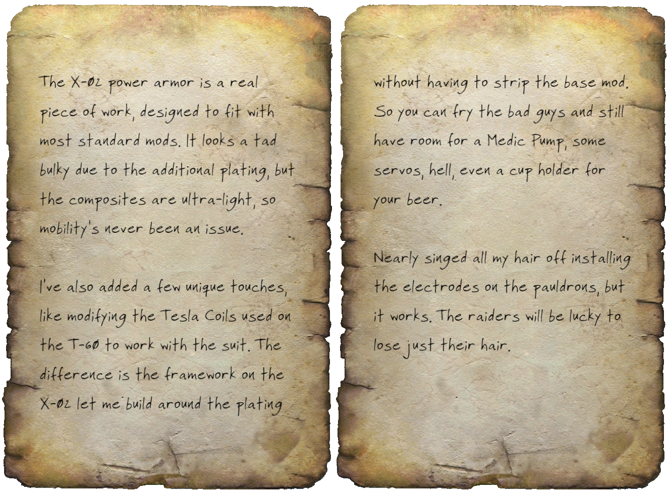 Notes on the X-02 is a paper note in the Fallout 4 Creation Club content "X-02 Power Armor."