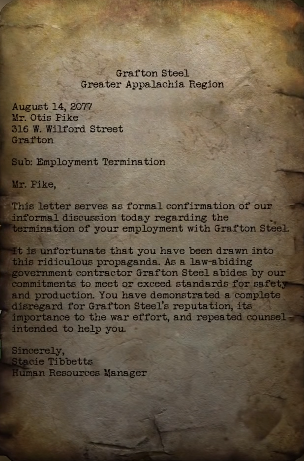 This letter serves as formal confirmation of our informal discussion today regarding the termination of your employment with Grafton Steel.
