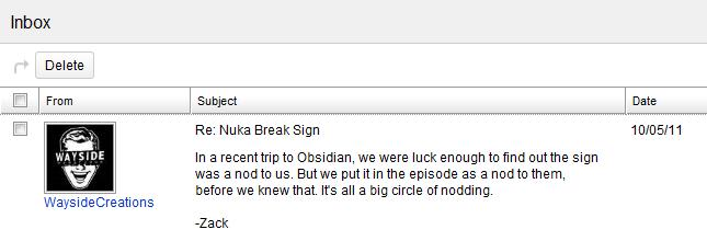 - ↑ Zack Finfrock, lead actor of the fan-made short film and webseries Fallout: Nuka Break: