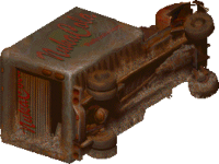 Here, you find a truck flipped over in the middle of the desert. It was likely used to transport Nuka-Cola bottles in its heyday, hence the large "Nuka Cola" logo. There is still one intact crate found beside the truck. The truck was possibly crashed by Lumpy, a ghoul who appears in Fallout 2 if you bring a Highwayman into Broken Hills.[1]