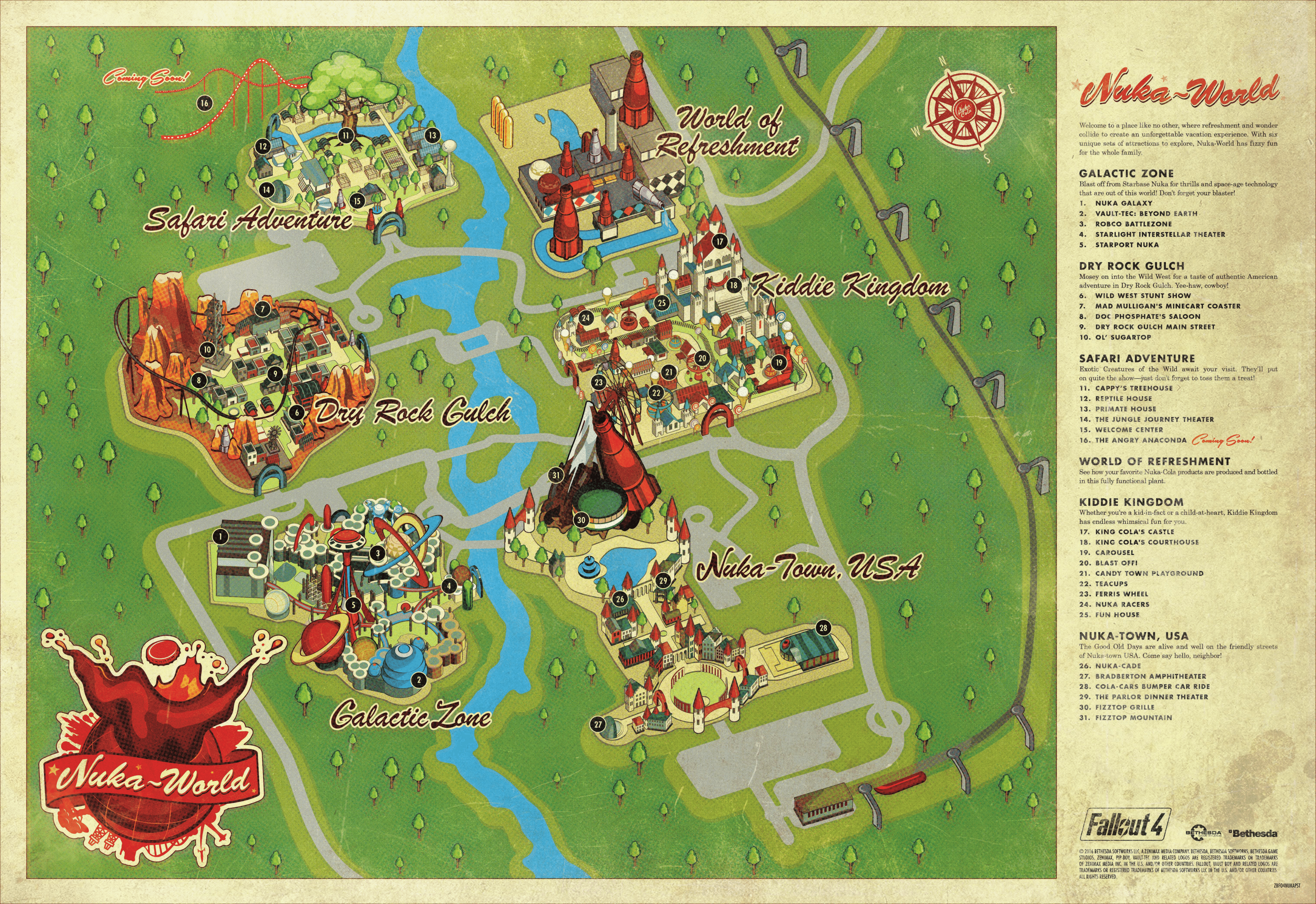 Nuka-World appears in the Fallout 4 add-on Nuka-World, in Fallout Shelter Online, and is mentioned only in Fallout 76 and its update Nuka-World on Tour.