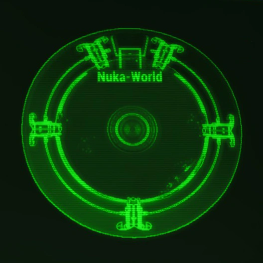 The Nuka-World junkyard is on the southwestern outskirts of Nuka-World, due west of Nuka-Town USA. There is a large warehouse at the main entrance to the east. The junkyard proper consists of a network of winding trenches and pathways surrounded by piles of debris, with intermittent pockets of radiation reaching as high as +30 rads per second.