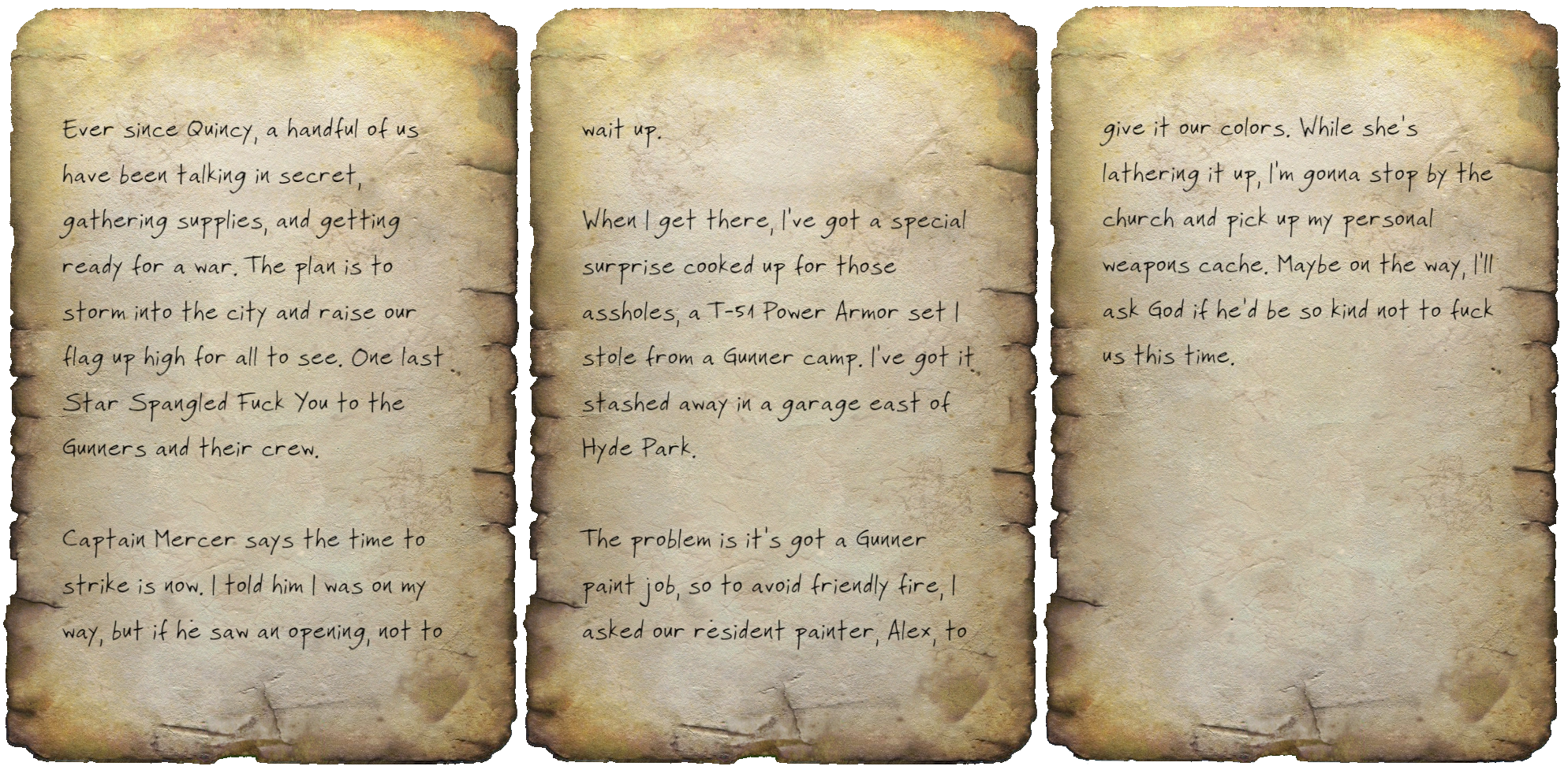 When I get there, I've got a special surprise cooked up for those assholes, a T-51 Power Armor set I stole from a Gunner camp. I've got it stashed away in a garage east of Hyde Park.