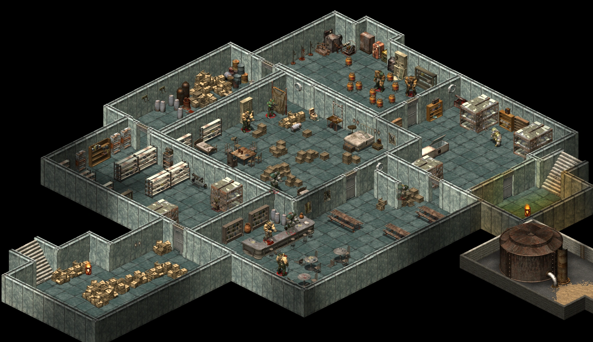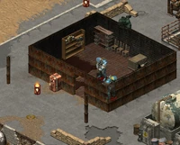 Do not go through the door at the top as it is a trap. In the doorway on the left there will be a super mutant with a flamer thrower waiting. So as soon as you enter the room, run to the bottom edge, causing him to be unable to reach you with his weapon. Once this room is clear, the next will be the final room with Latham and a super mutant waiting for you. They will both fire simultaneously so approaching the automatic door in the prone position is suggested. Once he is dead the mission will be complete, but before you leave, make sure to check the (easy to miss) chest at the foot of the bed. Inside will be a briefcase, which upon inspection by the Scribes will turn out to be a remote nuclear detonator. There is also a holodisk near the left side of the table, close to the left corner of the solid-backed brown chair. It is hidden by the wall so you have to carefully search with your mouse cursor until you find it. It IS there, it just takes some patience. General Dekker comments on the disk's recovery in his end of mission briefing, so it is worth finding.