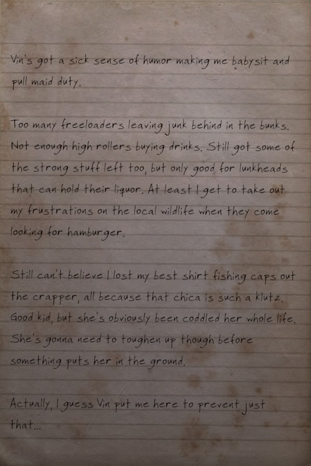 Too many freeloaders leaving junk behind in the bunks. Not enough high rollers buying drinks. Still got some of the strong stuff left too, but only good for lunkheads that can hold their liquor. At least I get to take out my frustrations on the local wildlife when they come looking for hamburger.