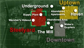 The steelyard opens to a ramp leading to a grounded trainyard. A stairway leads up to a rusted landscape of pipes, scrap heaps, and warehouses. An elaborate web of planks and scrap metal form bridges on the warehouses and pipes. In the east is a sluice leading to a moderately radioactive toxic waste dump site. In the far southwest of the landscape is a stairway leading up to the roof of a building where some wildmen have set up camp. This camp is also adjacent to Wernher's hideout.