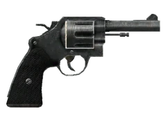 A double-action .357 revolver with a swing-out cylinder similar to that of a .44 Magnum instead of a loading gate like the standard .357 Magnum. Though it is a double-action, it is fired in a single-action form with the hammer being cocked back after each shot to increase accuracy.[Non-game 1] It features a short barrel and a worn matte black finish, lacks rear sights, and has a shorter hammer with a flat, textured spur compared to the smooth, rounded spur of the .357 Magnum revolver.