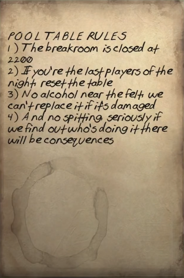 The note is found in Fort Defiance, on the wall of the break room on the fourth floor.
