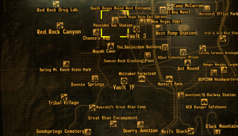 Situated near the beginning of Nevada State Route 160, southwest of the west entrance of the South Vegas ruins and northeast of Chance's map, the gas station's interior is inaccessible. Outside of the building, the player character will find a garbage can and a highway patrol car, both containing minor loot. Fire geckos will spawn in the empty land northwest of the gas station, along with deathclaws at higher levels.