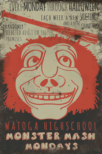 EACH WEEK A NEW VICTIM AND A NEW GRAND PRIZE RANDOMLY SELECTED ADULT ON THE PREMISES WATOGA HIGH SCOOL MONSTER MASH MONDAYS |