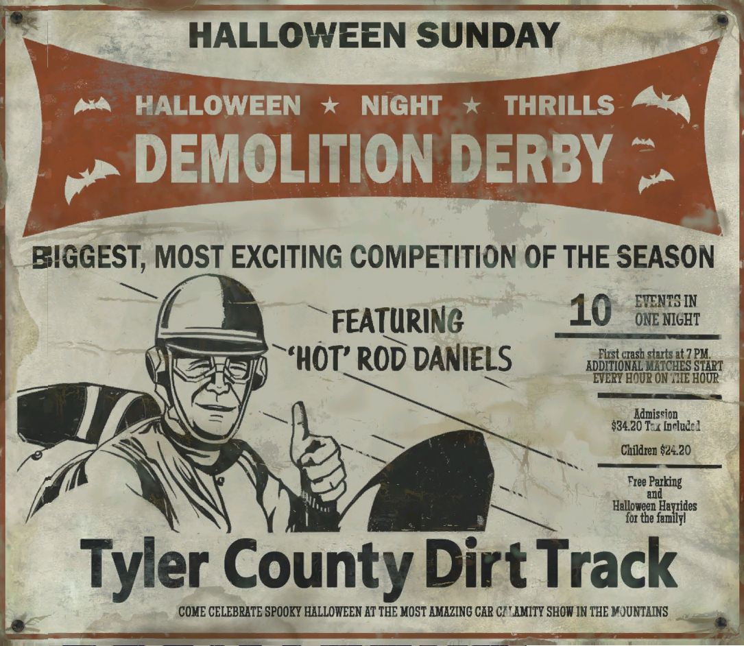 HALLOWEEN * NIGHT * THRILLS DEMOLITION DERBY BIGGEST, MOST EXCITING COMPETITION OF THE SEASON FEATURING 'HOT ROD' DANIELS 10 EVENTS IN ONE NIGHT First Crash at 7 PM ADDITIONAL MATCHES START EVERY HOUR ON THE HOUR Admission $34.20 Tax Included Children at $24.20 Free Parking and Halloween Hayrides for the Family! TYLER COUNTY DIRT TRACK COME CELEBRATE SPOOKY HALLOWEEN AT THE MOST AMAZING CAR CALAMITY SHOW IN THE MOUNTAINS |