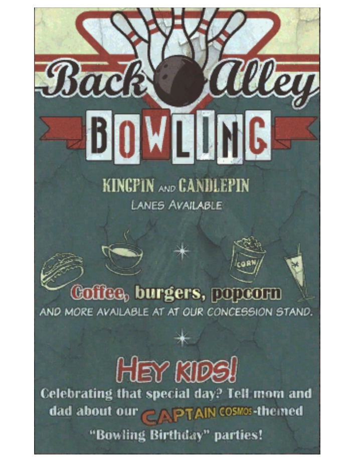 BOWLING KINGPIN AND CANDLEPIN LANES AVAILABLE Coffee, burgers, popcorn AND MORE AVAILABLE AT OUR CONCESSIONS STAND. HEY KIDS! Celebrating that special day? Tell mom and dad about our CAPTAIN COSMOS-themed "Bowling Birthday" parties. |